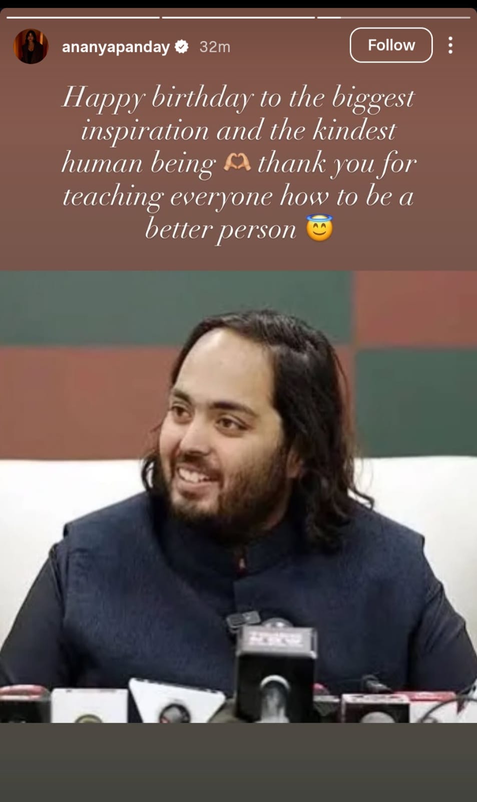 अनंत अंबानी के जन्मदिन पर बॉबी देओल और अनन्या पांडे ने भी सोशल मीडिया के जरिए शुभकामनाएं दीं .इसके अलावा रणवीर सिंह ने भी एक तस्वीर शेयर करते हुए लिखा, जन्मदिन मुबारक हो भाई.