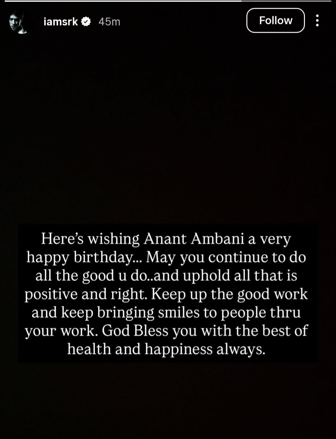 बॉलीवुड के किंग शाहरुख खान ने भी सोशल मीडिया के जरिए अनंत को शुभकामनाएं दीं. उन्होंने लिखा-जन्मदिन मुबारक हो अनंत. ऐसे ही अच्छा काम करते रहो और लोगों के चेहरों पर मुस्कान लाते रहो. खुदा तुम्हें लंबी उम्र, अच्छी सेहत और खुशियां दे.