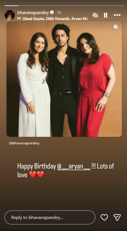 अनन्या पांडे की मां और चंकी पांडे की पत्नी भावना पांडे ने भी आर्यन को बधाई दी.उन्होंने आर्यन, खुद और महीप कपूर के साथ एक तस्वीर शेयर करते हुए लिखा –हैप्पी बर्थडे आर्यन... बहुत सारा प्यार