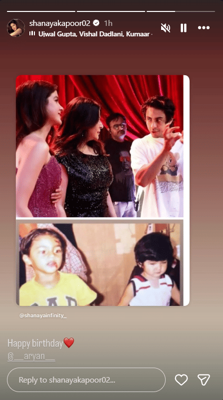 सुहाना की बेस्ट फ्रेंड शनाया कपूर ने इंस्टाग्राम पर दो तस्वीरों का कोलाज शेयर किया.पहली तस्वीर में आर्यन, शनाया और महीप कपूर बातचीत करते नजर आ रहे हैं, जबकि दूसरी तस्वीर उनके बचपन की है, जिसमें दोनों बेहद क्यूट दिख रहे हैं.