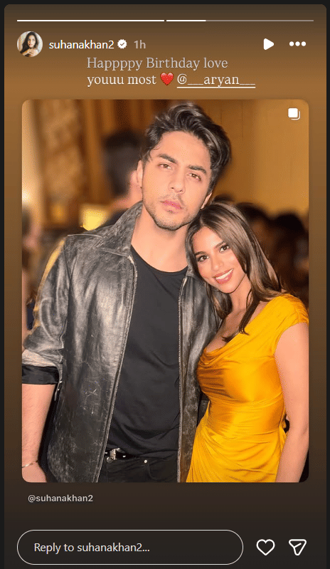 आर्यन की बहन सुहाना खान ने इंस्टा स्टोरी पर अपने भाई के साथ एक खूबसूरत तस्वीर शेयर की है. तस्वीर में सुहाना आर्यन को गले लगाते हुए मुस्कुरा रही हैं.उन्होंने लिखा –हैप्पी बर्थडे... तुमसे बहुत प्यार करती हूं