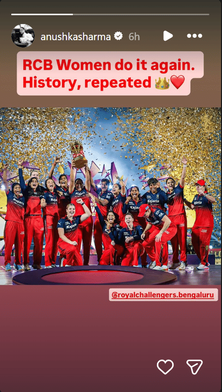 आरसीबी के पूर्व कप्तान विराट कोहली की पत्नी और अभिनेत्री अनुष्का शर्मा ने इस जीत पर खुशी जताई. अनुष्का ने अपने इंस्टा स्टोरी पर आरसीबी वुमेंस टीम की ट्रॉफी उठाते हुए एक तस्वीर शेयर की और लिखा-आरसीबी वुमेंस टीम ने फिर कमाल कर दिखाया. इतिहास दोहराया गया.